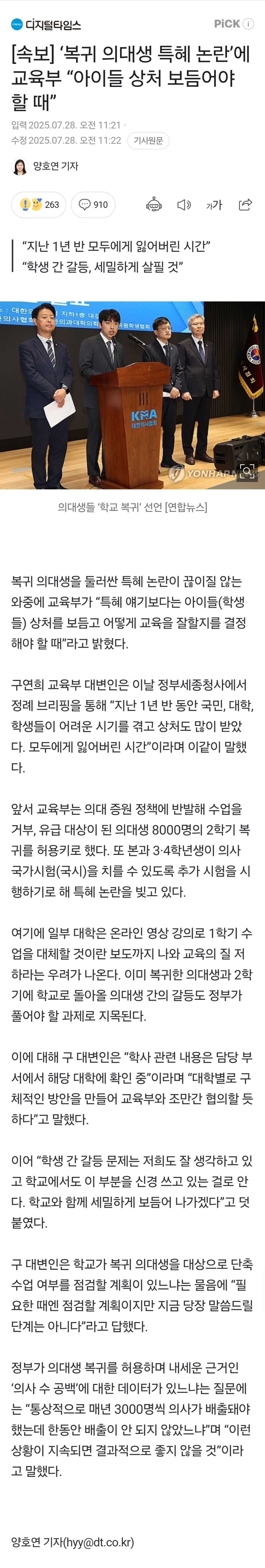 [스크랩] [속보] ‘복귀 의대생 특혜 논란’에 교육부 “아이들 상처 보듬어야 할 때” 작성자안경센빠이|작성시간25.07.28|조회수158 목록 댓글 4 글자크기 작게가 글자크기 크게가 https://naver.me/xxFxZ0HH[속보] ‘복귀 의대생 특혜 논란’에 교육부 “아이들 상처 보듬어야 할 때”복귀 의대생을 둘러싼 특혜 논란이 끊이질 않는 와중에 교육부가 “특혜 얘기보다는 아이들(학생들) 상처를 보듬고 어떻게 교육을 잘할지를 결정해야 할 때”라고 밝혔다. 구연희 교육부 대변n.news.naver.comㅋ 다음검색 스크랩 원문 : 도탁스 (DOTAX) 현재 게시글 추가 기능 열기 북마크 공유하기 신고 센터로 신고 댓글 댓글 4 댓글쓰기 답글쓰기 댓글 리스트 작성자헬헬따리 | 작성시간 25.07.28 성인인데 무슨 아이들ㅋㅋㅋ성인답게 자기 행동에 책임지도록 해야지 언제까지 애처럼 다룰거노. 이태원사고때도 느꼈지만 좌빨들은 20대를 미성숙한 존재로 생각하는거임?? 작성자노빠꾸사딸라 | 작성시간 25.07.28 염.병 작성자코린이가즈아☆ | 작성시간 25.07.28 아이들 상처 ㅋㅋㅋㅋㅋㅋㅋㅋㅋㅋㅋㅋㅋㅋㅋㅋㅋㅋㅋㅋㅋㅋㅋㅋㅋㅋㅋ 작성자ecoele | 작성시간 25.07.29 역겹다 ㅋㅋㅋㅋ 댓글 전체보기