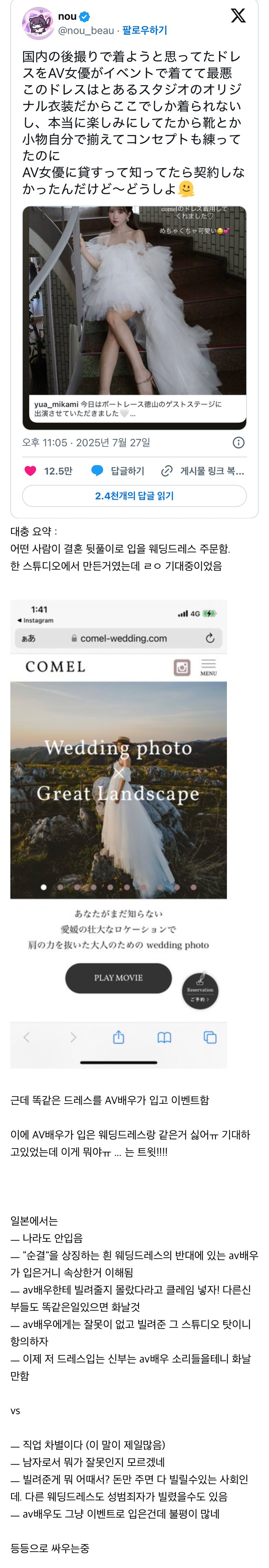 [스크랩] 일본) AV 배우가 입었던 웨딩드레스 내가 입기싫다 VS 차별이다 작성자노빠꾸사딸라|작성시간25.07.28|조회수461 목록 댓글 4 글자크기 작게가 글자크기 크게가 다음검색 스크랩 원문 : 樂soccer 현재 게시글 추가 기능 열기 북마크 공유하기 신고 센터로 신고 댓글 댓글 4 댓글쓰기 답글쓰기 댓글 리스트 작성자데라도지 | 작성시간 25.07.28 시른데? ㅅㅂ 작성자통모짜핫도그 | 작성시간 25.07.28 ㅋㅋ 싫긴싫다 이유가 뭐냐고 물으면 그냥 좀 그래 … 작성자ukrina | 작성시간 25.07.28 옷이 날개인데 가치가 떨어지면 입기 싫은 건 당연한 것 작성자향가향가 | 작성시간 25.07.28 이쁘면 된다 댓글 전체보기
