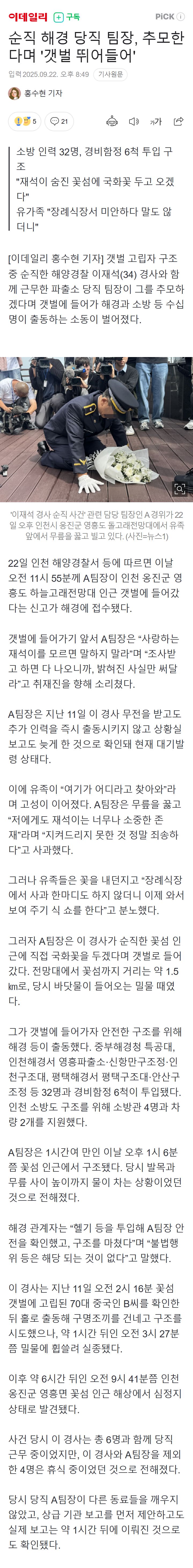 순직 해경 당직 팀장, 추모한다며 '갯벌 뛰어들어' 작성자선배녀(안웃게)|작성시간25.09.22|조회수263 목록 댓글 0 글자크기 작게가 글자크기 크게가 다음검색 현재 게시글 추가 기능 열기 북마크 공유하기 신고 센터로 신고 댓글 댓글 0 댓글쓰기 답글쓰기 댓글 리스트