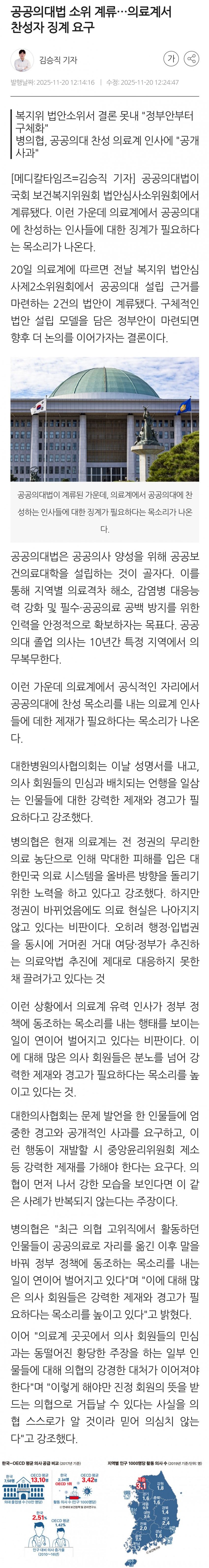 병의협, "공공의대 찬성 의사 징계해라" 작성자선배녀(안웃게)|작성시간25.11.20|조회수174 목록 댓글 0 글자크기 작게가 글자크기 크게가 다음검색 현재 게시글 추가 기능 열기 북마크 공유하기 신고 센터로 신고 댓글 댓글 0 댓글쓰기 답글쓰기 댓글 리스트