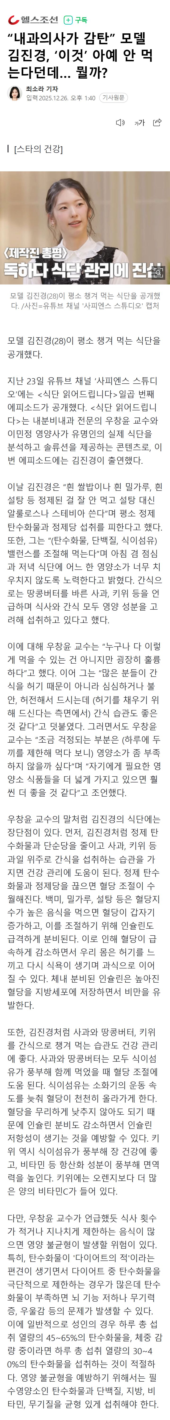 “내과의사가 감탄” 모델 김진경, ‘이것’ 아예 안 먹는다던데… 뭘까? 작성자선배녀(안웃게)|작성시간25.12.26|조회수224 목록 댓글 1 글자크기 작게가 글자크기 크게가 다음검색 현재 게시글 추가 기능 열기 북마크 공유하기 신고 센터로 신고 댓글 댓글 1 댓글쓰기 답글쓰기 댓글 리스트 작성자선배녀 | 작성시간 25.12.26 new 당을 ㅁㄹㅎㄹ ㅎㅈ? 댓글 전체보기