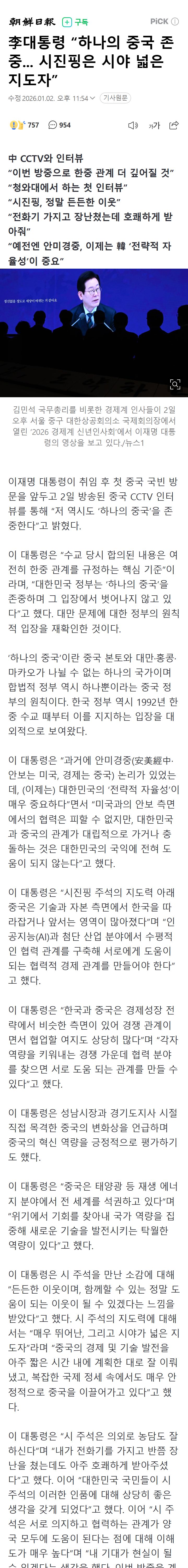 李대통령 “하나의 중국 존중... 시진핑은 시야 넓은 지도자” 작성자선배녀(안웃게)|작성시간26.01.03|조회수108 목록 댓글 2 글자크기 작게가 글자크기 크게가 다음검색 현재 게시글 추가 기능 열기 북마크 공유하기 신고 센터로 신고 댓글 댓글 2 댓글쓰기 답글쓰기 댓글 리스트 작성자선배녀 | 작성시간 26.01.03 습각하 만세라 ㅎㅈ? 작성자마케도니알 | 작성시간 26.01.03 하나의 중국 하나의 한국 ㅎㅈ? 댓글 전체보기
