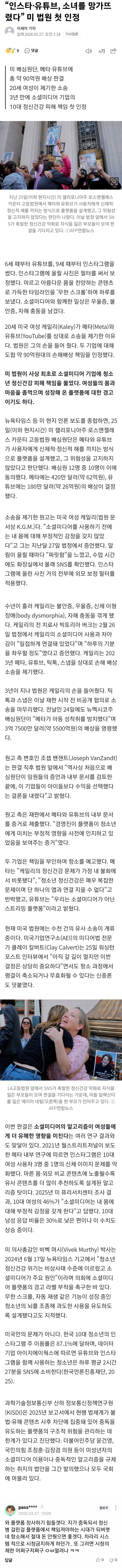 “인스타·유튜브, 소녀를 망가뜨렸다” 미 법원 첫 인정 작성자선배녀(안웃게)|작성시간26.03.27|조회수70 목록 댓글 1 글자크기 작게가 글자크기 크게가 다음검색 현재 게시글 추가 기능 열기 북마크 공유하기 신고 센터로 신고 댓글 댓글 1 댓글쓰기 답글쓰기 댓글 리스트 작성자선배녀 | 작성시간 26.03.27 도파민디톡스하라 ㅎㅈ? 댓글 전체보기