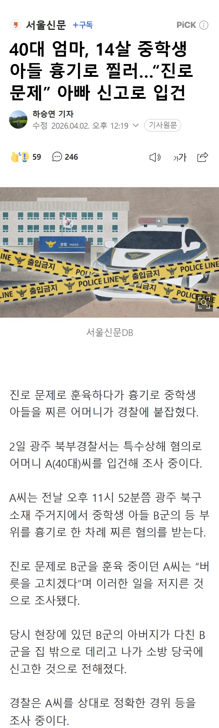 40대 엄마, 14살 중학생 아들 흉기로 찔러…“진로 문제” 아빠 신고로 입건 작성자선배녀(안웃게)|작성시간26.04.02|조회수89 목록 댓글 1 글자크기 작게가 글자크기 크게가 다음검색 현재 게시글 추가 기능 열기 북마크 공유하기 신고 센터로 신고 댓글 댓글 1 댓글쓰기 답글쓰기 댓글 리스트 작성자Yellow cow | 작성시간 26.04.02 전라도의 자녀사랑 ㄷㄷ 댓글 전체보기