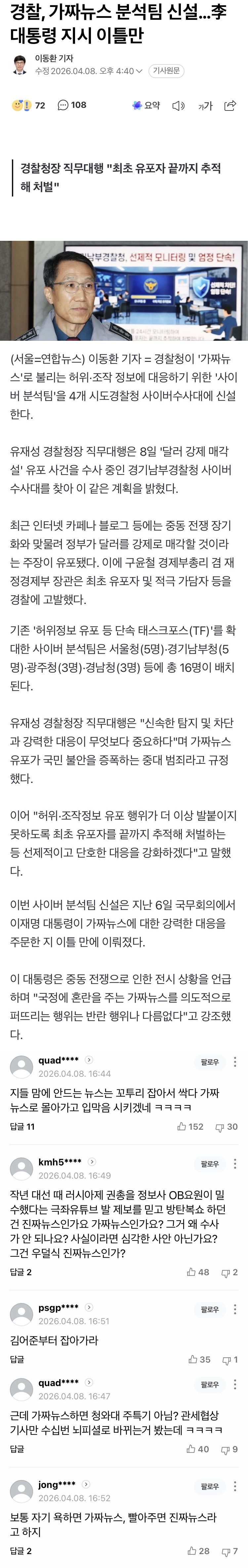 경찰,가짜뉴스 분석팀 신설..이재명 지시 이틀만 작성자선배녀(안웃게)|작성시간26.04.08|조회수141 목록 댓글 4 글자크기 작게가 글자크기 크게가 다음검색 현재 게시글 추가 기능 열기 북마크 공유하기 신고 센터로 신고 댓글 댓글 4 댓글쓰기 답글쓰기 댓글 리스트 작성자스탕달 | 작성시간 26.04.08 ㅉㅈ 작성자세븐일레븐. | 작성시간 26.04.09 독재? 작성자posthoolis | 작성시간 26.04.09 소설이다. 아님말고. 붙여가면서 인신공격 일삼는 모 방송인, 자칭 총수 있지 않냐? 작성자이호성 | 작성시간 26.04.09 국민 입틀막법 ㅋㅋ 댓글 전체보기