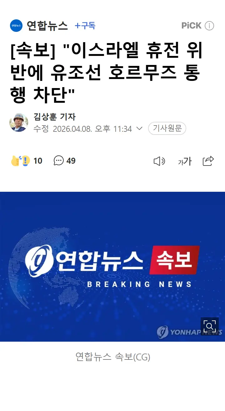 [속보] "이스라엘 휴전 위반에 유조선 호르무즈 통행 차단" 작성자선배녀(안웃게)|작성시간26.04.08|조회수113 목록 댓글 1 글자크기 작게가 글자크기 크게가 다음검색 현재 게시글 추가 기능 열기 북마크 공유하기 신고 센터로 신고 댓글 댓글 1 댓글쓰기 답글쓰기 댓글 리스트 작성자엠쥐 | 작성시간 26.04.08 ㅉ 댓글 전체보기