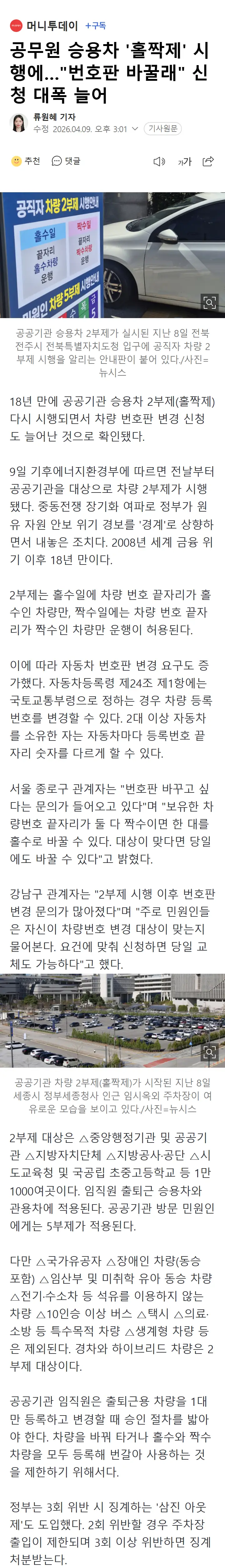 공무원 승용차 '홀짝제' 시행에…"번호판 바꿀래" 신청 대폭 늘어 작성자선배녀(안웃게)|작성시간26.04.09|조회수145 목록 댓글 2 글자크기 작게가 글자크기 크게가 다음검색 현재 게시글 추가 기능 열기 북마크 공유하기 신고 센터로 신고 댓글 댓글 2 댓글쓰기 답글쓰기 댓글 리스트 작성자선배녀 | 작성시간 26.04.09 반동분자들은 드럼통형에 처하라! 작성자[지옥]이온성액체[지옥] | 작성시간 26.04.09 국민통제는 역시 ! 댓글 전체보기