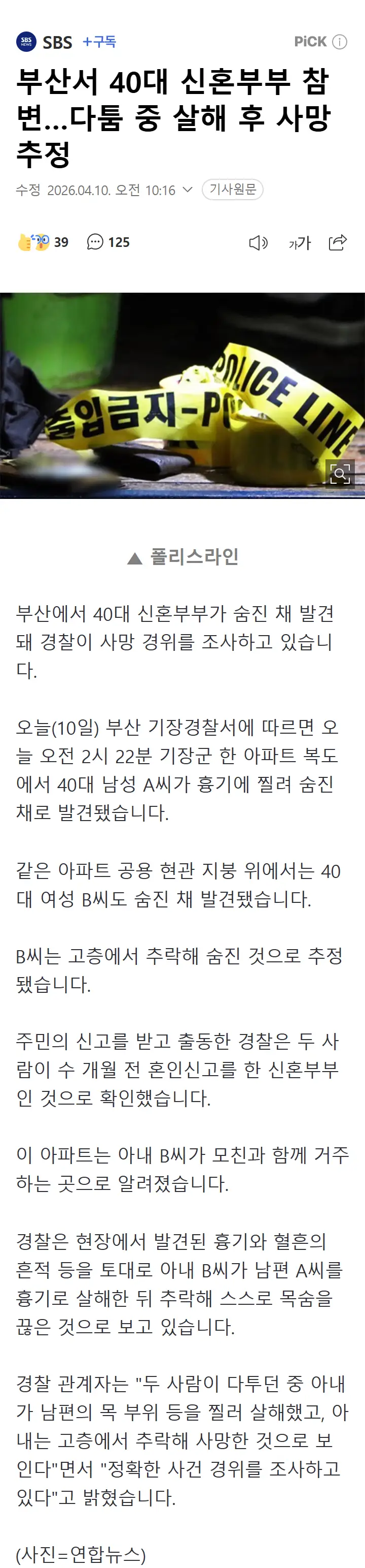 부산서 40대 신혼부부 참변…다툼 중 살해 후 사망 추정 작성자선배녀(안웃게)|작성시간26.04.10|조회수110 목록 댓글 3 글자크기 작게가 글자크기 크게가 다음검색 현재 게시글 추가 기능 열기 북마크 공유하기 신고 센터로 신고 댓글 댓글 3 댓글쓰기 답글쓰기 댓글 리스트 작성자Ralph-Lauren | 작성시간 26.04.10 new ㅠㅠ.. 작성자[지옥]이온성액체[지옥] | 작성시간 26.04.10 new 부.산. 작성자마초맨 | 작성시간 26.04.10 new ㄷㄷㄷ 댓글 전체보기