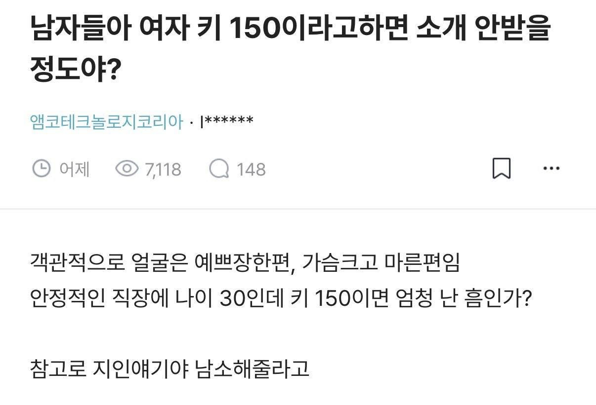 여자 150이랑 결혼했다가 아들 낳았는데 키 160이면 어떻게 하려고;