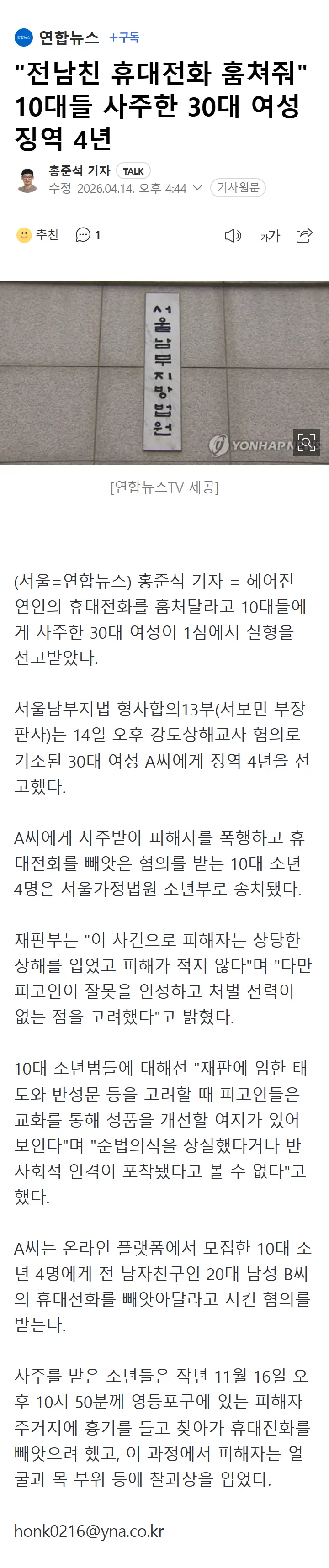 "전남친 휴대전화 훔쳐줘" 10대들 사주한 30대 여성 징역 4년 작성자선배녀(안웃게)|작성시간26.04.15|조회수118 목록 댓글 2 글자크기 작게가 글자크기 크게가 다음검색 현재 게시글 추가 기능 열기 북마크 공유하기 신고 센터로 신고 댓글 댓글 2 댓글쓰기 답글쓰기 댓글 리스트 작성자선배녀 | 작성시간 26.04.15 new ㅎㄴㄴㅁㄷ? 작성자마초맨 | 작성시간 26.04.15 new 멀리하라 댓글 전체보기