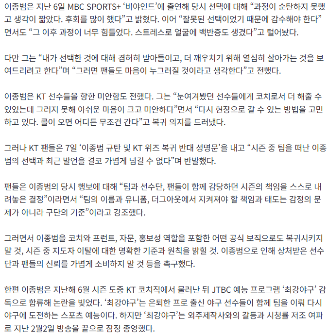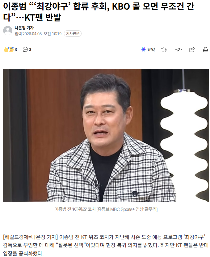 [스크랩] 이종범 “‘최강야구’ 합류 후회, KBO 콜 오면 무조건 간다” 작성자바람의전설|작성시간26.04.15|조회수186 목록 댓글 4 글자크기 작게가 글자크기 크게가 다음검색 스크랩 원문 : 도탁스 (DOTAX) 현재 게시글 추가 기능 열기 북마크 공유하기 신고 센터로 신고 댓글 댓글 4 댓글쓰기 답글쓰기 댓글 리스트 작성자이런시바 | 작성시간 26.04.15 돈을 얼마나 주면 프로팀을 내팽겨치고 티비프로로 가냐 작성자김페퍼 | 작성시간 26.04.15 시발 미친놈 아니냐 ㅋㅋ 답댓글 작성자장관 | 작성시간 26.04.15 장나라 시구때 안타 때려서 맞힐뻔하고 사과도없이 갈때 부터 제정신은 아닌거 같았음 작성자존경습각하2025 | 작성시간 26.04.15 걍 고교야구감독정도하시면 맞을듯 댓글 전체보기