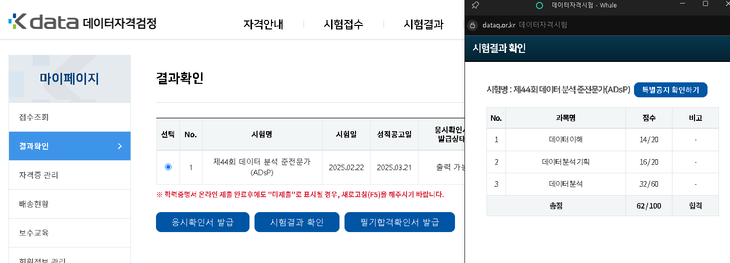 [성취]제44회 데이터 분석 준전문가(ADsP) 합격 작성자☆toogosss☆|작성시간25.03.15|조회수514 목록 댓글 10 글자크기 작게가 글자크기 크게가 1. 사내 프로그램으로 강의 수강 및 응시료 지원 받아 무일푼 취득은 자랑2. 60점 커트라인인데 62점으로 통과한 건 자랑3. 실기와 밀접한 데이터 분석 3과목 반타작인 건 한탄 (빅데이터분석기사, ADP 어쩌지...) 다음검색 현재 게시글 추가 기능 열기 북마크 공유하기 신고 센터로 신고 댓글 댓글 10 댓글쓰기 답글쓰기 댓글 리스트 답댓글 작성자☆toogosss☆ 작성자 본인 여부 작성자 | 작성시간 25.03.16 고마워! 작성자결정 | 작성시간 25.03.15 답댓글 작성자☆toogosss☆ 작성자 본인 여부 작성자 | 작성시간 25.03.16 작성자세븐일레븐. | 작성시간 25.03.16 축하~나두 이거 살짝 고민중인데 ㅋㅋ 답댓글 작성자☆toogosss☆ 작성자 본인 여부 작성자 | 작성시간 25.03.16 궁금한 부분있으면 댓글 남겨줘. 알려줄께. 댓글 전체보기