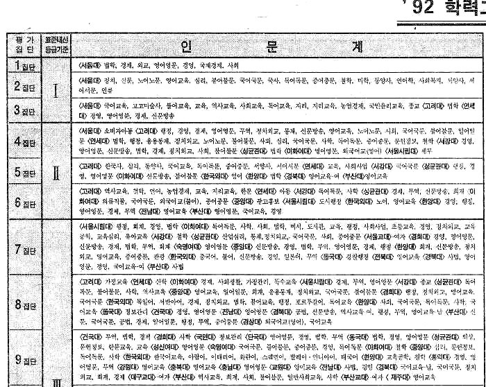 작성자골미다스미골 작성시간 10.08.13 헐...서강대 불어불문(현재 국제문화2) >>> 고대 사학, 심리, 국어교육, 독어독문, 중어중문, 서양사, 서어서문, 역사교육, 철학, 언어, 농업경제(현재 식자경), 교육, 지리교육,한문.....연대 아동, 교육, 사회사업.....성대 행정, 경영, 영문, 경제, 무역, 신방, 회계, 통계..(성대 법 빼고 전부 킬) 이었네. 저 때는 군이 같을 때였으니.....결론은 연고대 가군빨이 서강대 나군빨보다 훨씬 크고, 반사이익도 훨씬 컸다는 증거임. ㅠ