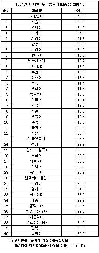 1994년 대학별 수능평균커트(총점 200점) 작성자tjtjdgkswnd|작성시간12.01.22|조회수1,719 목록 댓글 2 글자크기 작게가 글자크기 크게가 서울대 연세대 고려대 서강대 한양대 중앙대 이화여대 시립대 외대 부산대 아주대 동국대 경희대 성균관대 건국대 단국대 숭실대 경북대 홍익대 -------------------------- 다음검색 현재 게시글 추가 기능 열기 북마크 공유하기 신고 센터로 신고 댓글 댓글 2 댓글쓰기 답글쓰기 댓글 리스트 작성자dusrhgks | 작성시간 12.01.22 서강은 전화기만 있어서 높지..잡과가 한공처럼 있으면 뚝 떨어짐. 작성자보보리안티팬 | 작성시간 12.01.22 이대 시립대 외대 점수가 같은데 칸은 왜다른거여ㅋ 댓글 전체보기