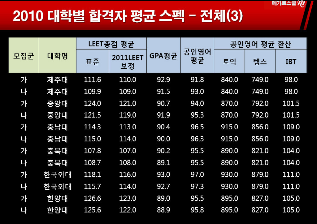 제주대 로스쿨(나) : 리트 46 + 영어 92.9 + 학점 91.5 = 230.4