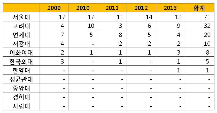 최근 5년간 외무고시 대학별 합격자 현황(2009~2013)
