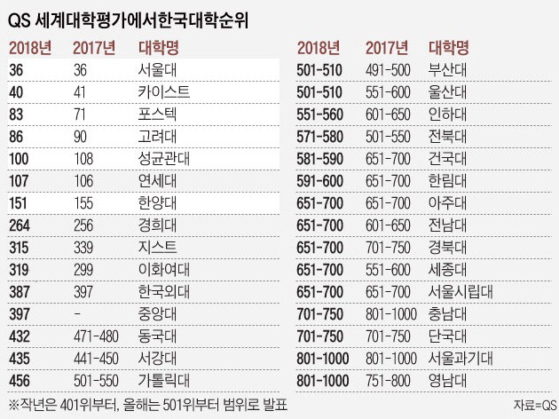[NEW 2018년 6월 7일 발표] 2018 QS 세계대학순위 서울대 36위 - 고려대 86위 - 성균관대 100위 - 연세대 107위