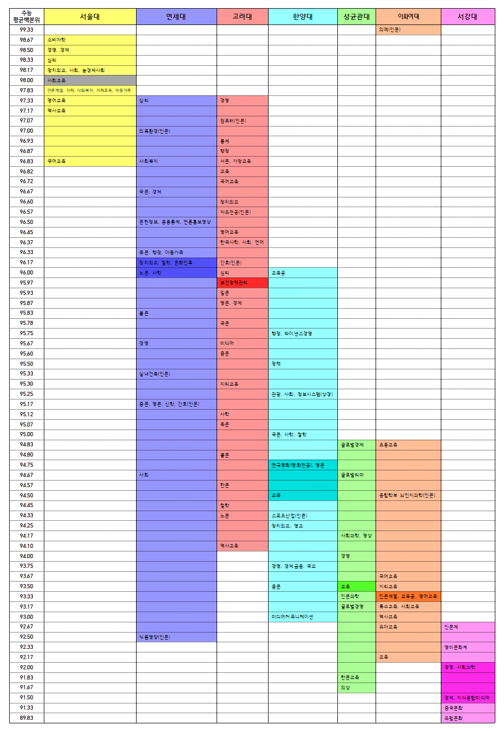 2021 정시 대교협발표 주요 7개대학 최종등록자 70%-cut 평균백분위 기준 학과순위(인문) 작성자키미투|작성시간21.07.06|조회수2,908 목록 댓글 2 글자크기 작게가 글자크기 크게가 * 진한 색깔은 중위 학과 다음검색 현재 게시글 추가 기능 열기 북마크 공유하기 신고 센터로 신고 댓글 댓글 2 댓글쓰기 답글쓰기 댓글 리스트 작성자고4A | 작성시간 21.07.06 연대 심리 뭐냐 작성자추트레인성훈추 | 작성시간 21.07.07 이걸 누가믿누 댓글 전체보기