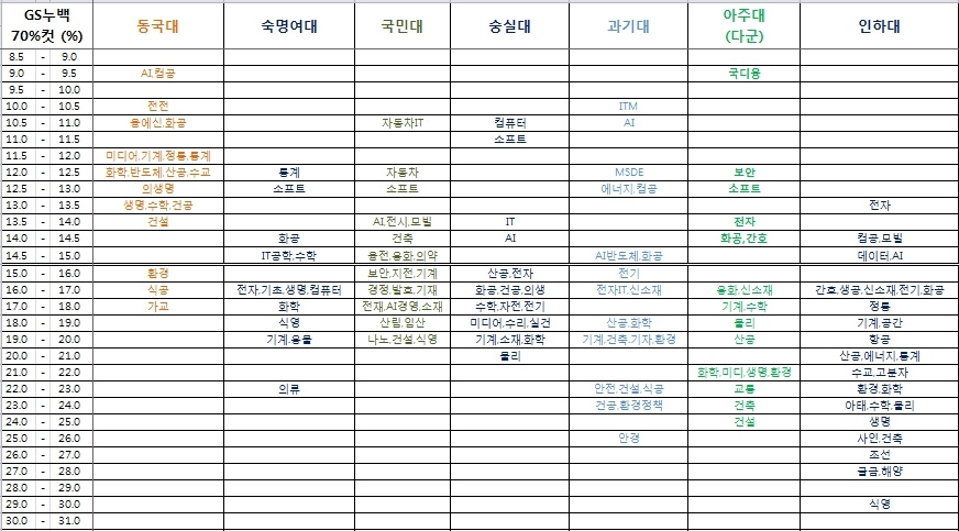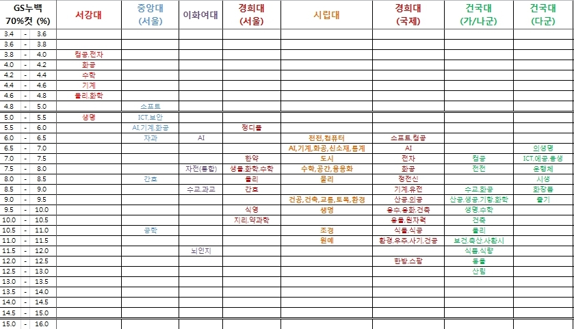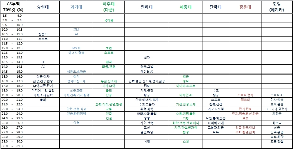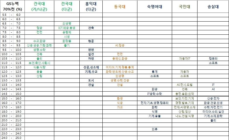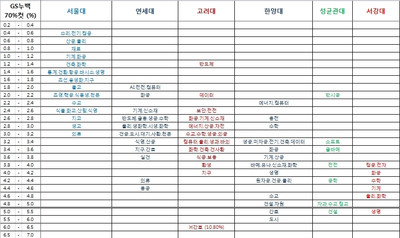 - 교육부와 대교협에서 매년 발표하는 "대학 어디가" (https://www.adiga.kr/EgovPageLink.do?link=EipMain)에 22학년도 각 대학 정시 70%컷 점수를 GS누백으로 환산한 %임