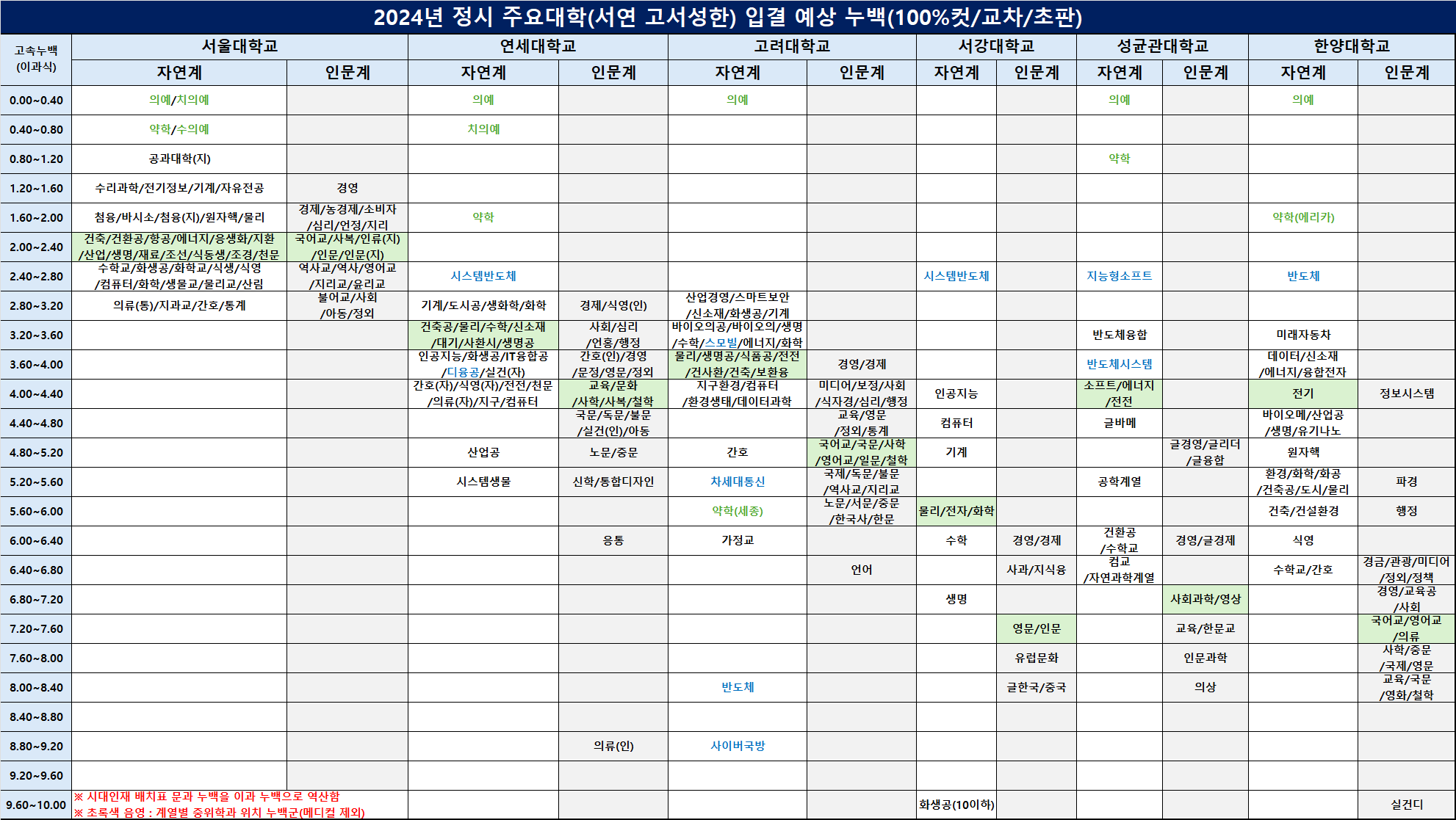24년 정시 주요대학 입결(문/이과 교차) 작성자이호성|작성시간24.03.03|조회수3,791 목록 댓글 1 글자크기 작게가 글자크기 크게가 아래 시대인재 저 배치표 보고 만든 듯 다음검색 현재 게시글 추가 기능 열기 북마크 공유하기 신고 센터로 신고 댓글 댓글 1 댓글쓰기 답글쓰기 댓글 리스트 작성자심심해03 | 작성시간 25.04.26 고려대 세종이랑 한양대 에리카는 왜 넣냐? 골때리네.. 같은 학교가 아닌데...법인이 다르다.....고시 및 회계사등에도 고려대는 세종이랑 에리카 같이 넣는다.. 에리카 애들이나 세종애들은 열받을듯... 댓글 전체보기