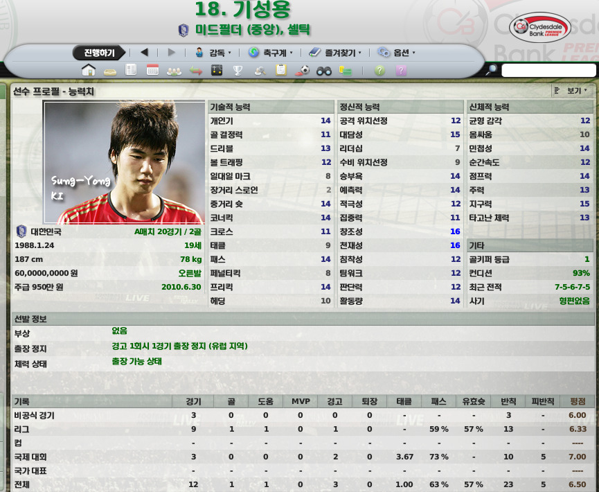 기성용은 SPL 소속이라 어빌을 낮게 배정 받은 불운한 선수입니다. 국내 선수들 중 그래도 높은 편에 속하니 위안으로 삼아야죠.