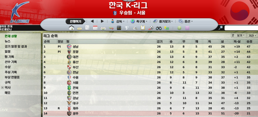 K리그, 에펨 08 최신 로스터는 상주 상무를 과감히 N리그로 내렸습니다. 수도권 더비로 유명한 수원과 서울은 성적이 좋지 않네