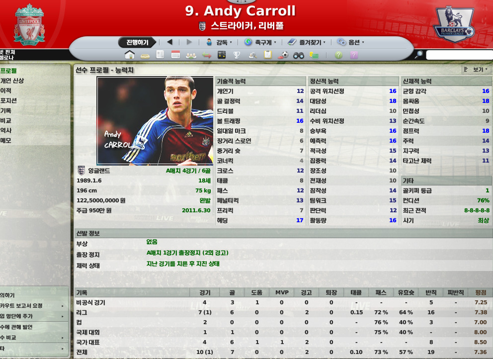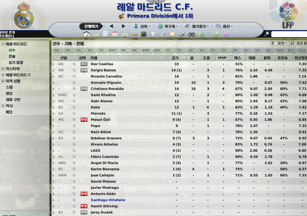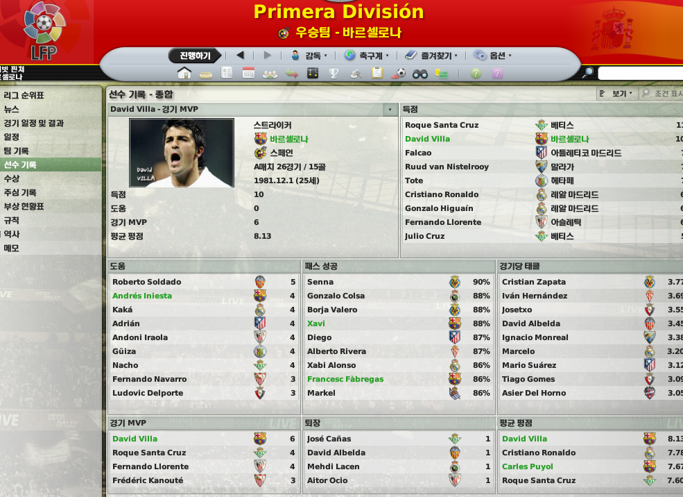 다음은 선수 기록입니다. 제라드와 캐롤이 있어 행복합니다. 근데 놀라운 건 박주영이 MVP 상위 랭크 되어 있다는 점.