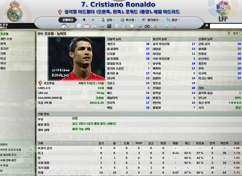 다음은 영원한 메시 라이벌 호날두입니다. 역시 능력치는 메시와 더불어 에펨 최강입니다. 특히 순속과 주력이 워낙 좋고