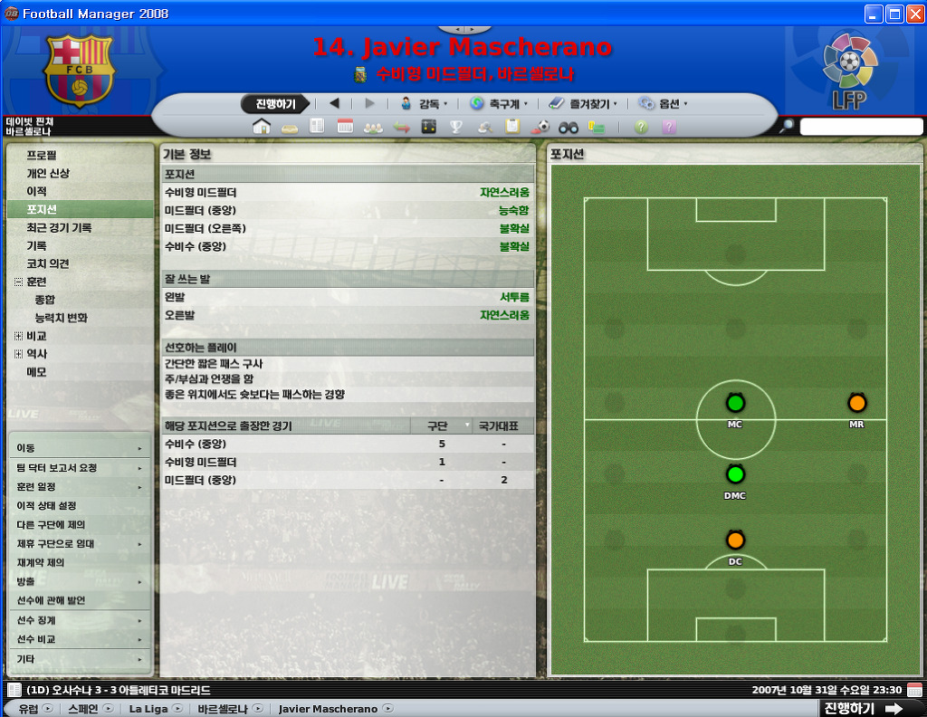 제일 고민이 마스체라노 활용이었습니다. 이미 경쟁 포지션엔 부스케츠가 있는데, 능력치가 마스체라노보다 더 낫더군요.