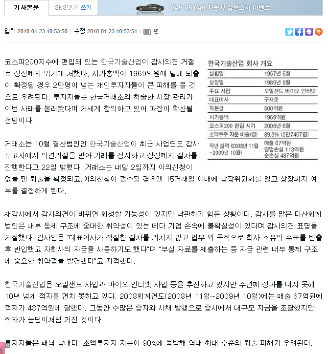 코스피200종목이었다가 감사의견 거절로 상장폐지된 한국기술산업