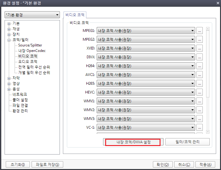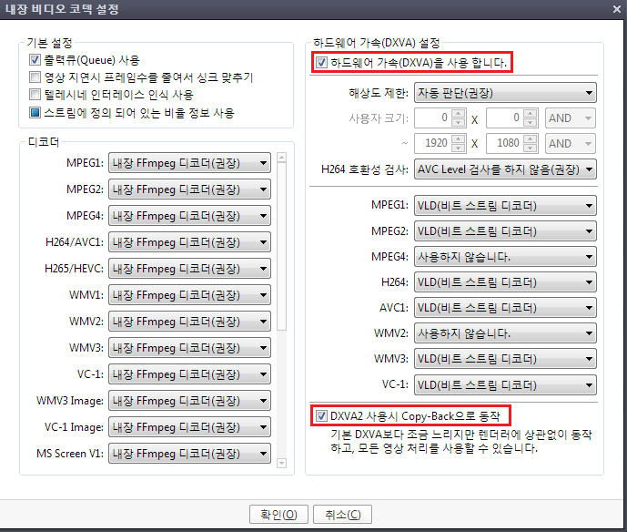하드웨어가속(DXVA) 설정에서 사용체크 DXVA2사용시 copy-back으로 동작 체크하시면 됩니다.