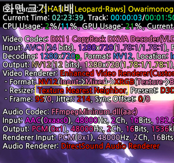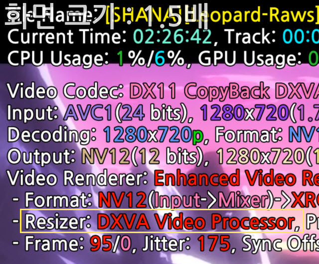 아래는 단축키로 화면을 1.5배로 만들어서 스샷을 찍은 것입니다. DxVA Video Processor(DxVA 스케일러)가 동작을 하고 있지요?