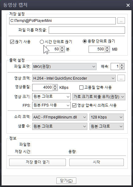4. 팟플에서 영상캡처를 열고 시작 버튼을 눌러서 녹화를 시작하면 끝~