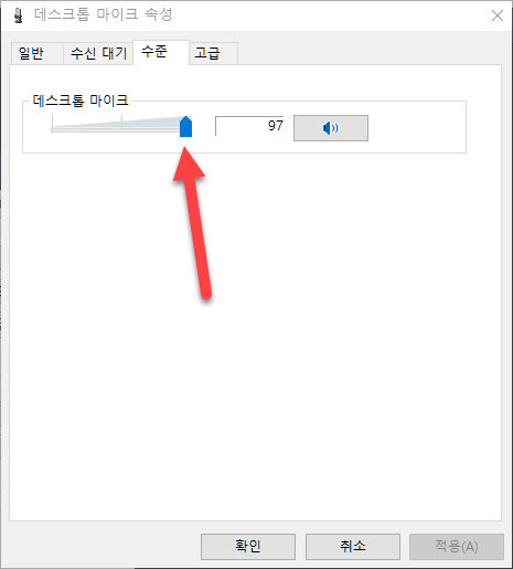 레벨미터의 수준이 너무 낮은 경우 데스크톱 마이크(웹캠 마이크)를 더블 클릭해서 아래 스샷을 참고하여 수준을 올리면서 마이크 테스트를 해 봅니다. 윈도우 10에서 마이크 입력 볼륨 기본값이 85인데 제 경우 소리를 질러야 레벨미터가 움직이더군요. 그래서 97정도로 주었습니다. 마이크와 거리가 멀어서 그런 거 같네요.