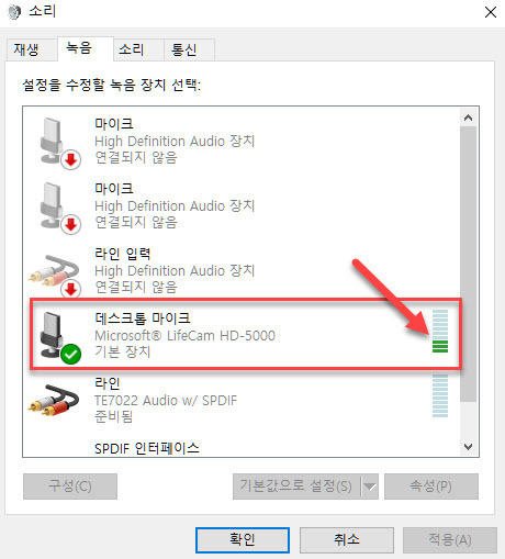 여기까지 확인했다면 웹캠의 마이크로 소리가 잘 입력되고 있는 상황입니다.
