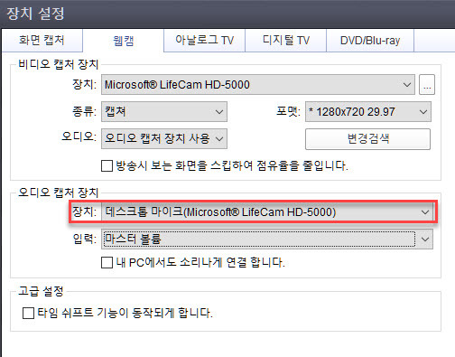 여기서 오디오 캡처 장치를 아까 설정한 웹캠으로 입력합니다.