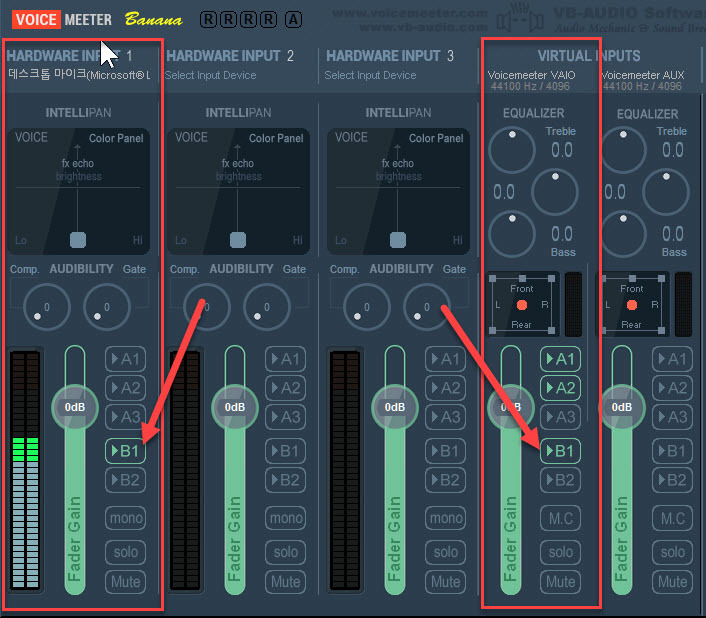 2. 그것을 믹서의 버스(B1)를 통해서 가상 출력(녹음) 장치에 같이 연결합니다. (위 스샷의 두 화살표)