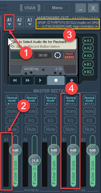 3. 이러면 믹서상에서 이 두 소리(마이크 입력과 시스템 입력)가 믹싱이 된 상태에서 가상 출력 장치로 나가게 되는데(아래의 빨간색 4번) 여기서 마이크 입력은 위 스샷의 Hardware Input 1을 시스템 입력은 Voicemeeter VAIO를 말합니다. 위 스샷을 잘 보면 이 두 입력의 공통적인 부분이 B1버스를 타고 B1으로 출력중이라는 것을 알 수 있는데 이렇게 같은 버스를 타는 신호는 믹싱이 된 상태로 B1으로 출력이 됩니다. 여기서 B1은 아래의 빨간색 4번의 레벨미터 동작으로 신호 출력 여부를 알 수 있습니다.