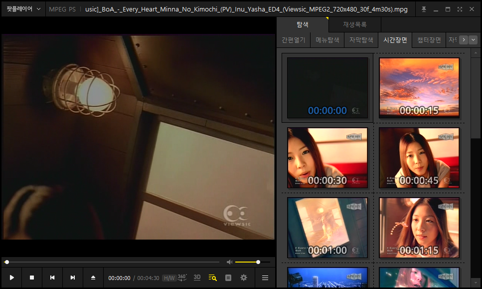 위의 그림처럼 하단의 탐색기 모양의 아이콘을 클릭하면 오른쪽에 탐색이라는 창이 나오며, 여기에 간편열기, 메뉴탐색, 자막탐색, 장면탐색등이 나옴니다.