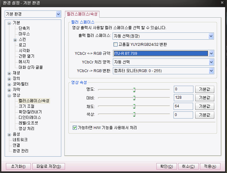팟플레이어로 BD립 영상이나 HDTV립 영상을 볼 때 자동 선택으로 하면 색영역을 BT.601로 잡더군요.