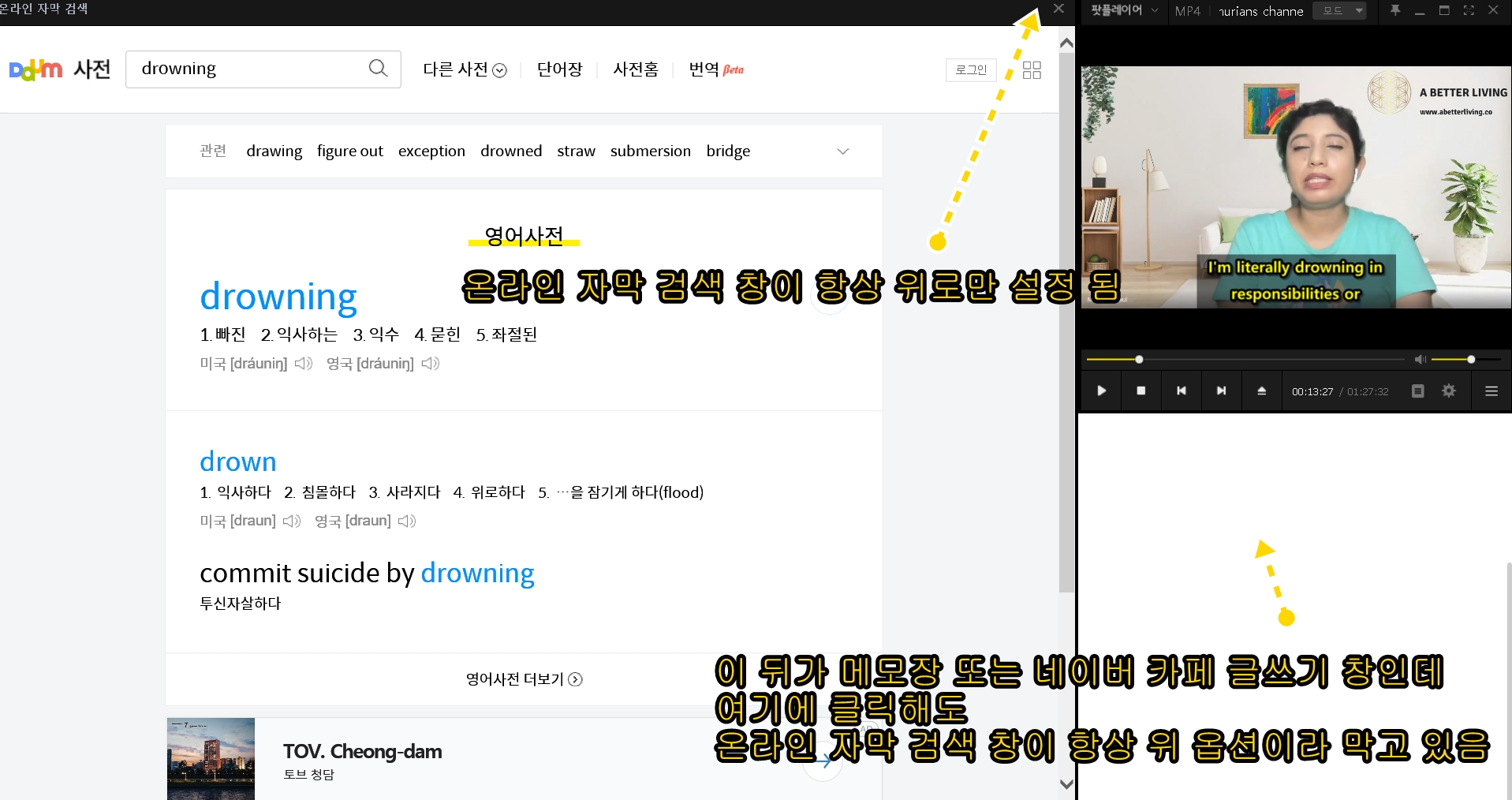 온라인 자막 검색창이 '항상 위' 뿐만 아니라 '항상 위' 안되는 옵션도 설정 가능하면 좋겠습니다. ^^