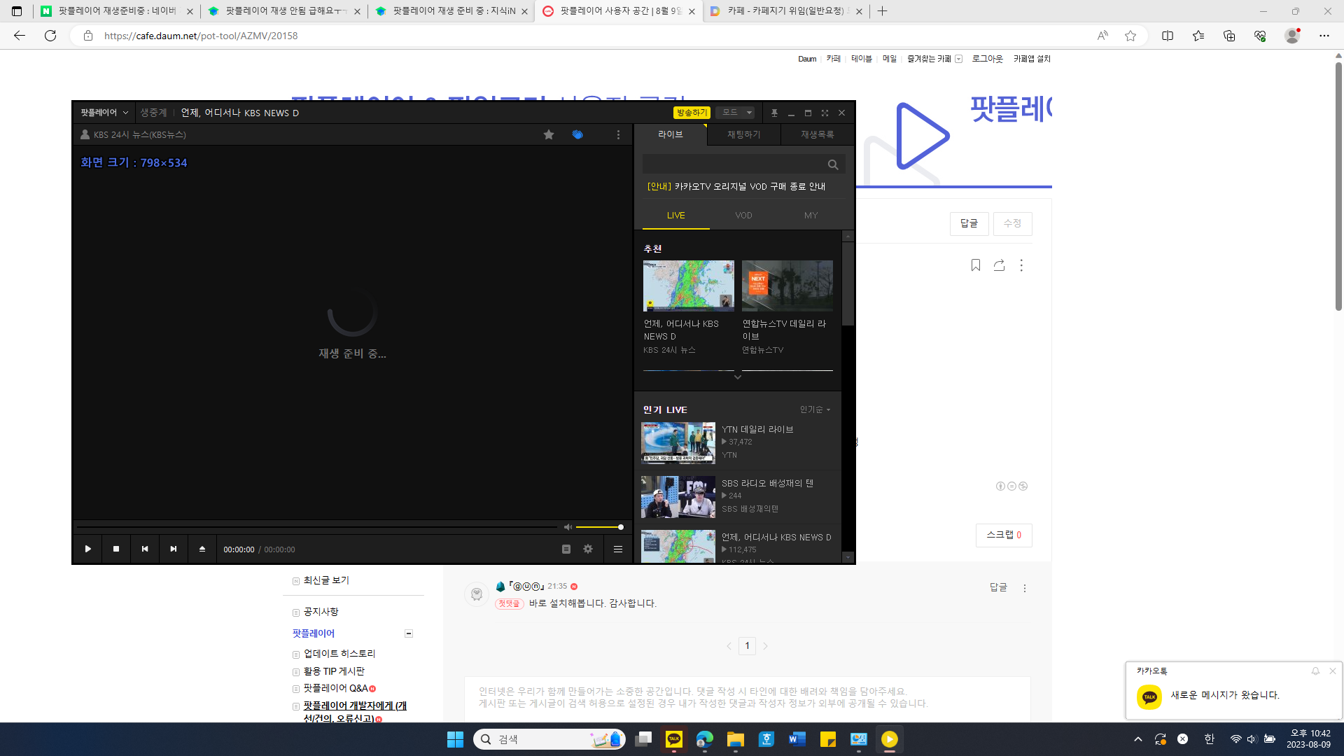 이 카페를 찾은 후 가장 최신 버전(23/8/9)으로 재설치 해보았는데도 여전히 재생 준비중에 멈춰있고 영상 재생이 안됩니다.