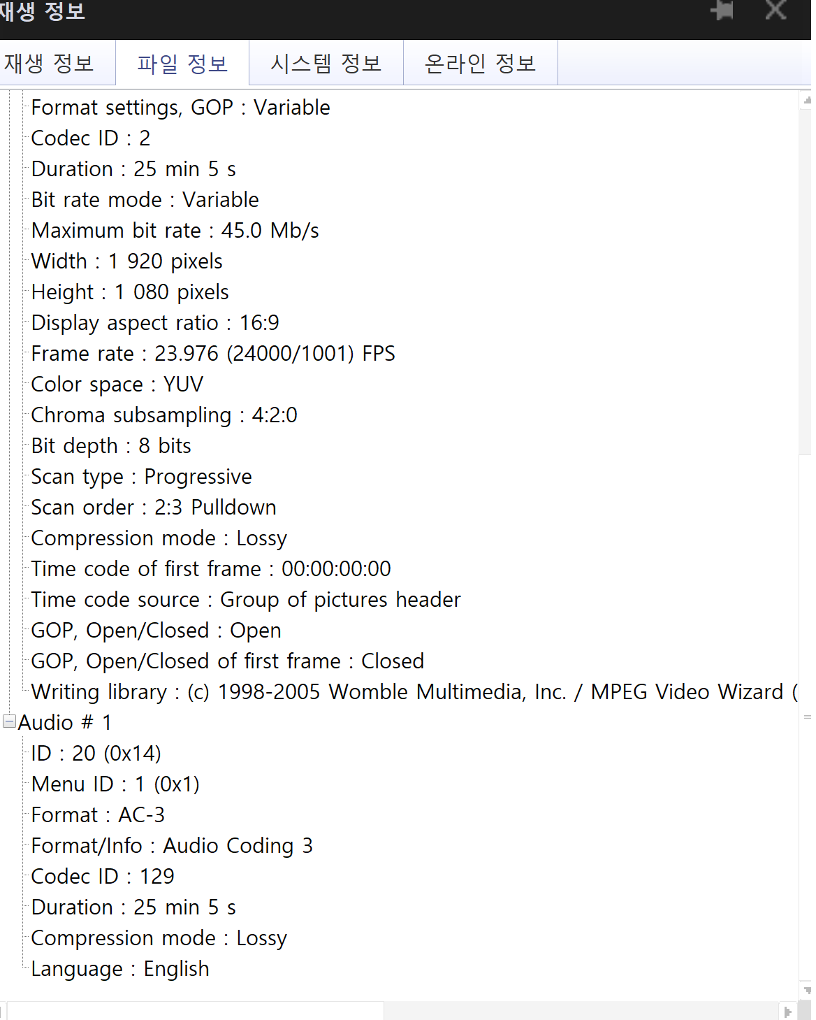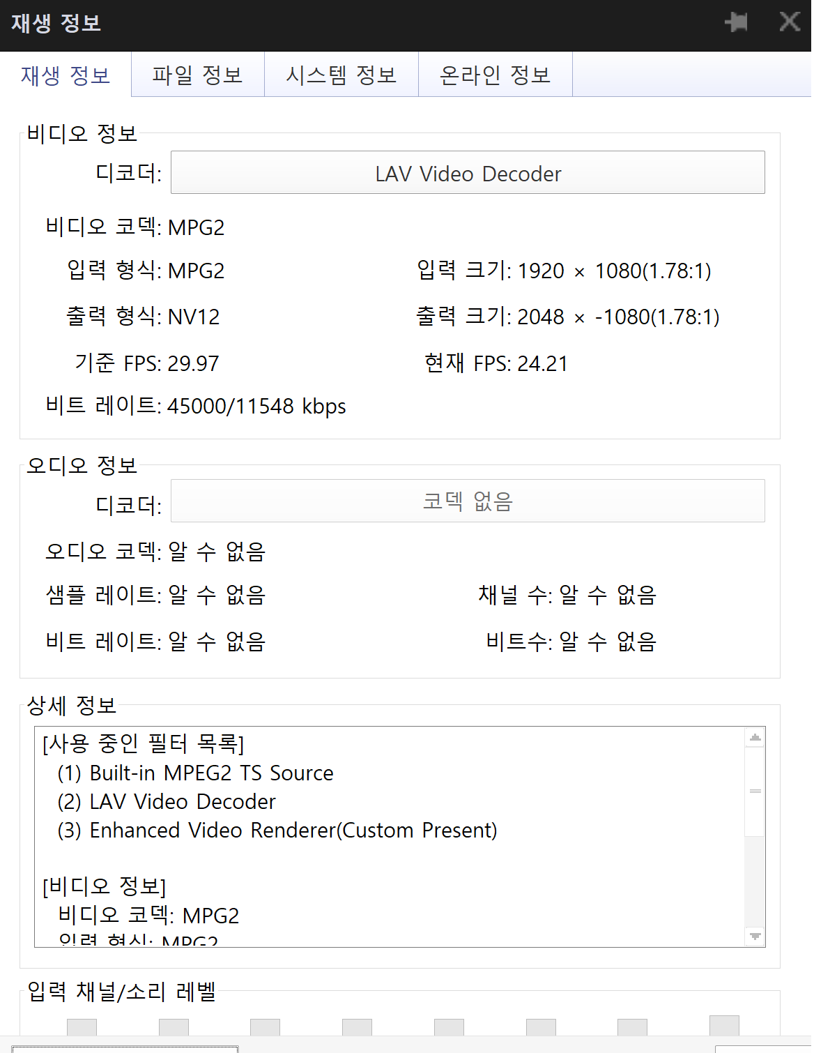 재생 정보, 파일정보 저의 오디오 필터 정보를 송부드리오니 어떤 문제인지 알려주세요.
