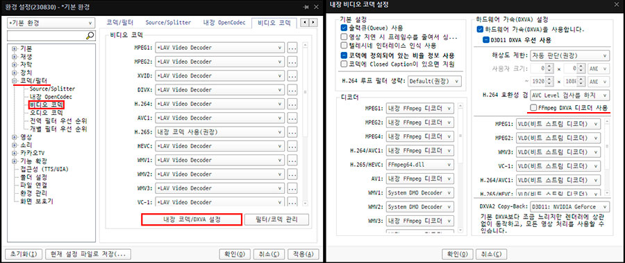 '환경설정 - 코덱/필터 - 비디오 코덱 - 내장 코덱/DXVA 설정'에 들어가서,