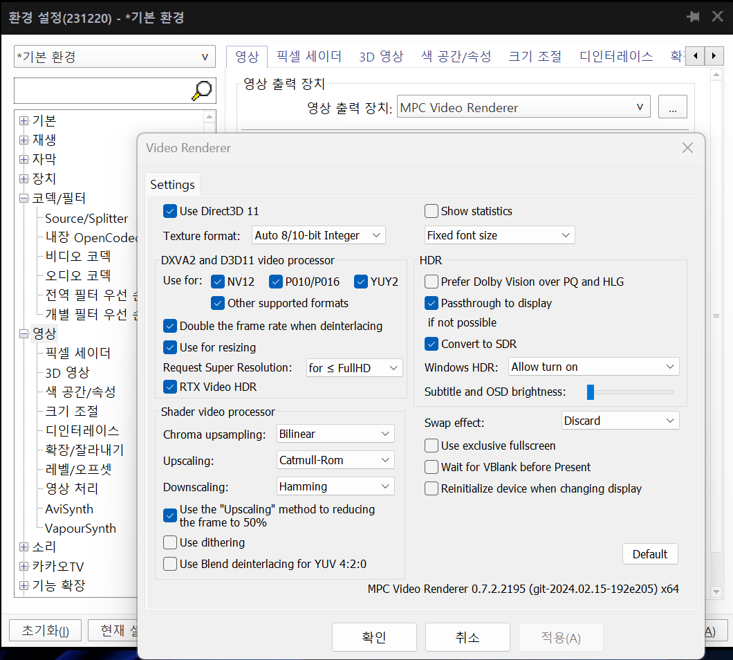 참고로 팟플레이어의 개발자 버전에도 RTX HDR 기능이 들어갔으므로 굳이 MPC 비디오 렌더러를 사용할 이유는 없습니다. -