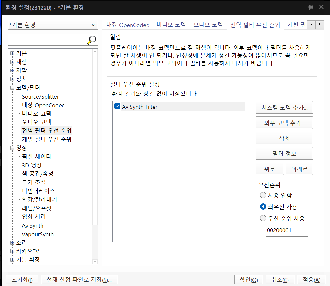 플레이어 설정은 아래와 같이 사용하고 있으며, SVP4 Pro 사용중입니다. 감사합니다.