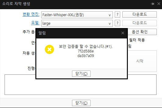 잘만 쓰고 있다가 어제부터 갑자기 자막 생성이 되지 않아서, 지난번에 비슷한 일이 있었을 때 제거/재설치한 후로 여태까지 잘 썼던 기억 나서 그대로 했는데, 계속해서 이 에러가 떠서 실패하며 이전 엔진/모델도 다 날려먹어 복구도 못하고 수동 다운로드 페이지 https://cafe.daum.net/pot-tool/AZMV/20546 에서 파일을 받아 풀어봤더니 CRC에러가 떠서 수동설치 역시 작동하지 않습니다.
