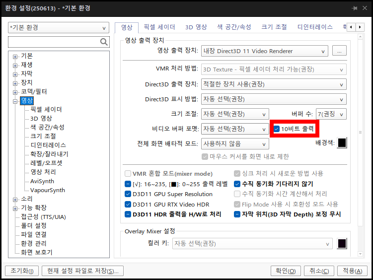 "10비트 출력"만 켜면, 아래와 같이 사용불가합니다.