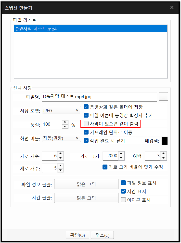 위 처럼 영상에 스냅샷을 만들때 붉은 네모의 자막이 있으면 같이 출력 기능을 종종 사용합니다.