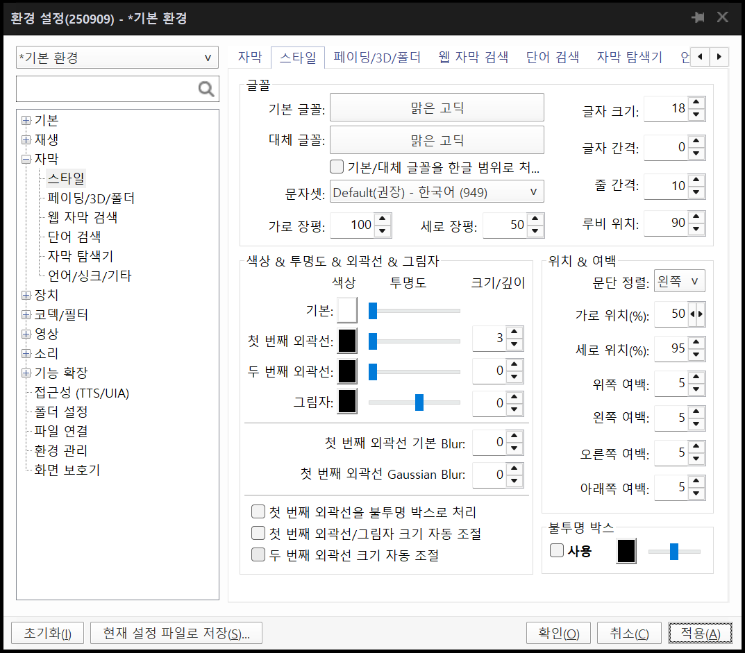 이를 보정하려면, 아래처럼 자막스타일에서 세로 장평을 50%로 맞추는 과정이 필요합니다.
